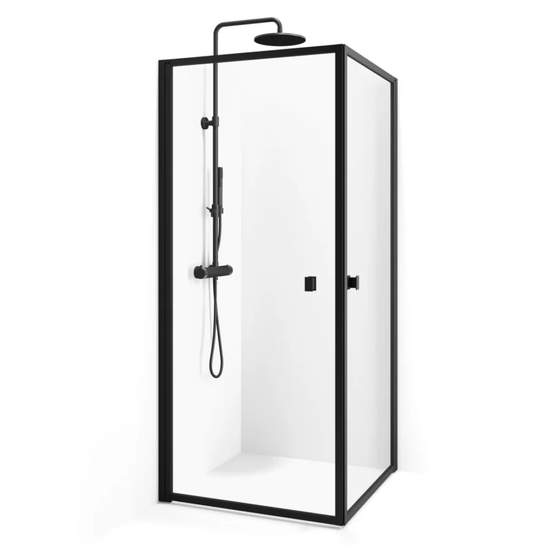 Klart glass og sorte profiler. Dusjdør for montering med fastfelt, eller sett sammen to dører til dusjhjørne. Ved montering av to dører for komplett hjørne, trenger man også profilpakke NRF nr. 6291712.