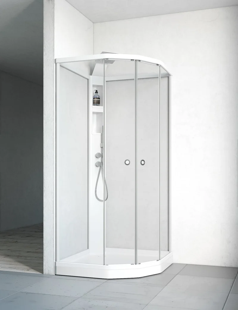 LAV 81×81 cm, 1940×1020 cm. Hvit profil, klart glass. Dusjkabinett i stilrent design uten synlige skjøter. Velg mellom ulike paneler, med eller uten hyller, skjult eller synlig dusjtermostat. Dusjkar i helstøpt støpemarmor.